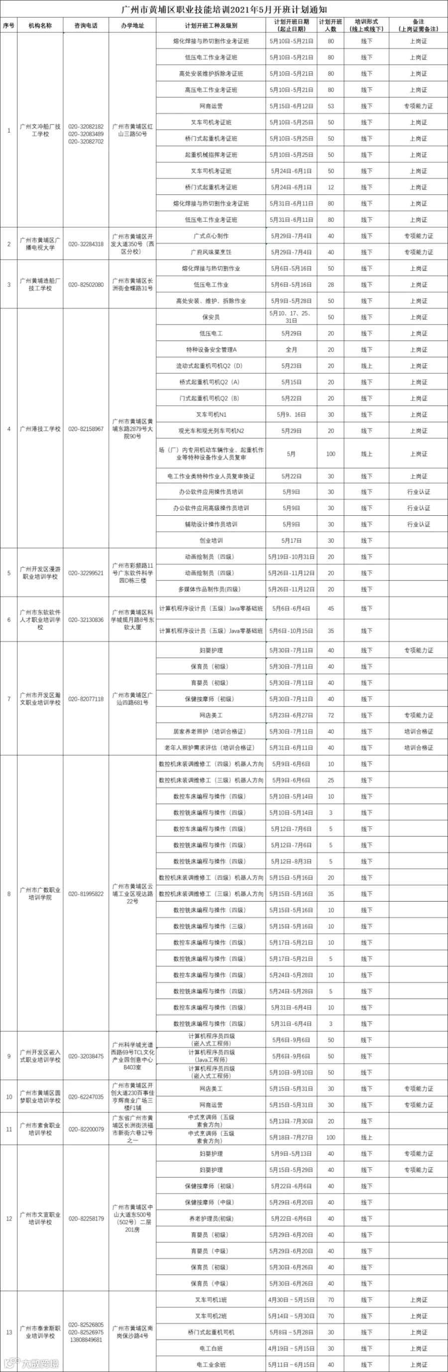 广州市黄埔区职业技能培训2021年5月开班计划通知