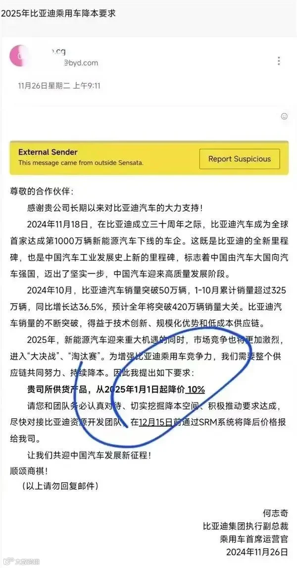 简单来说,就是比亚迪向一些供应商发了封邮件,要求从明年起所有供货产品降价10%。同时,这篇邮件的语气过于强硬,让人感觉不像商量,而更像“通知”。