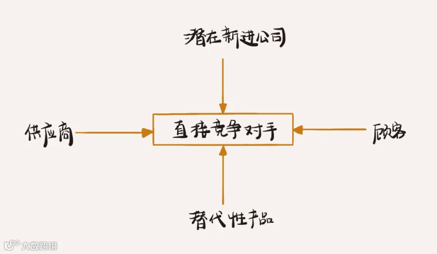 :波特五力模型。从直接竞争对手、顾客、供应商、潜在新进公司、替代性产品这5个方面,去分析企业面临的竞争格局。