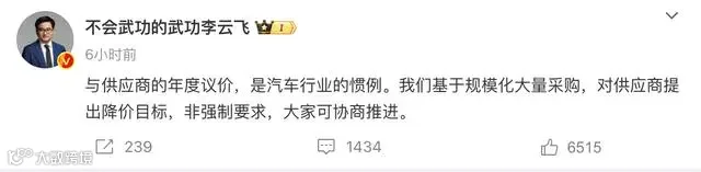 随后,比亚迪集团品牌及公关处总经理李云飞,在自己的微博紧急做出了回应。他表示与供应商的年度议价是汽车行业的惯例,比亚迪基于规模化大量采购,对供应商提出降价目标,但并非强制要求,双方可以通过协商来推进。