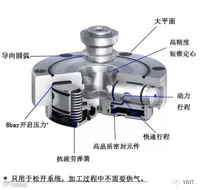 Power Function 已集成到每个夹具单元,可使用相当高的切削参数。启动时可增 加弹簧力,确保达到 25 kN 的极高夹持力。夹具系统通过弹簧组件机械锁定, 并具有自锁和刚性连接.