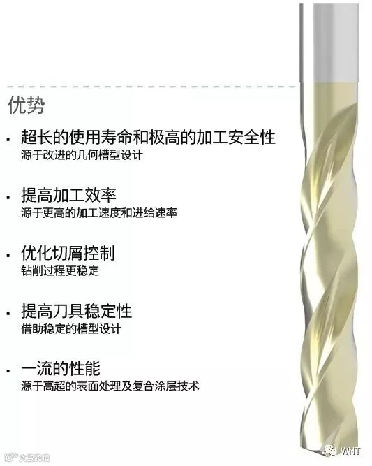 凭借特殊的几何角度设计及新涂层技术优化组合,此钻头是进行高难度材料切削的专业级刀具。此外,将其应用于钛合金、铬镍铁合金和不锈钢的测试中,其寿命依然有超长表现。
