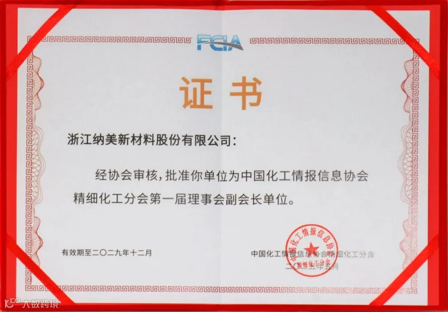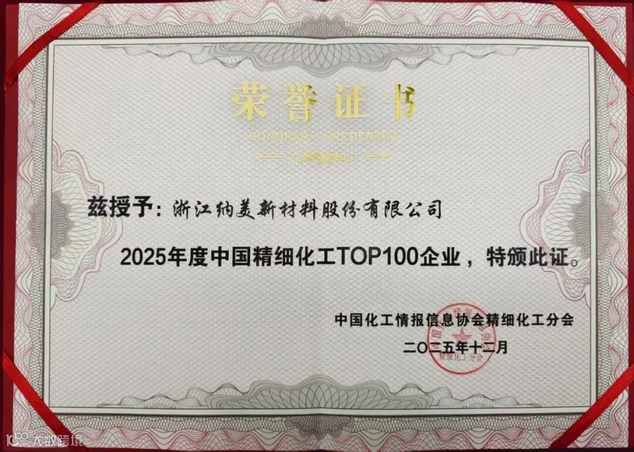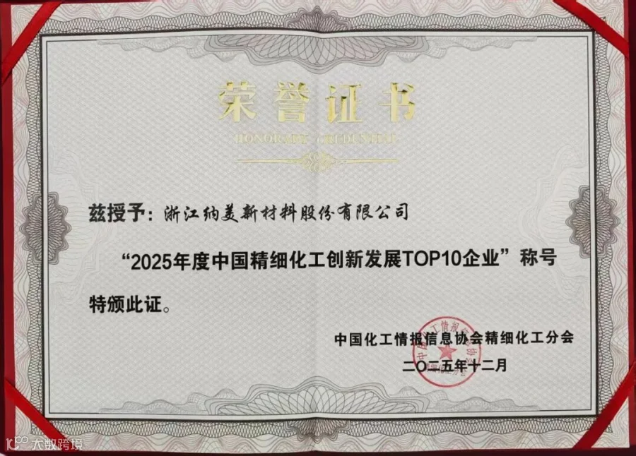 12月4日,第二十五届全国精细化工行业(宁东)大会暨2025中国精细化工百强发布会在宁夏宁东能源化工基地盛大开幕。“2025年度中国精细化工百强”榜单揭晓,浙江纳美新材料股份有限公司凭借在行业社会责任、创新、经营管理,影响力,以及绿色发展、等多方面的出色表现,斩获“2025年度中国精细化工百强企业”称号和2025年度中国精细化工创新发展 TOP10 企业,我司获颁中国化工情报信息协会精细化工分会副会长单位证书,董事长赵磊还被聘请第一届理事会副会长,实力再获认可。