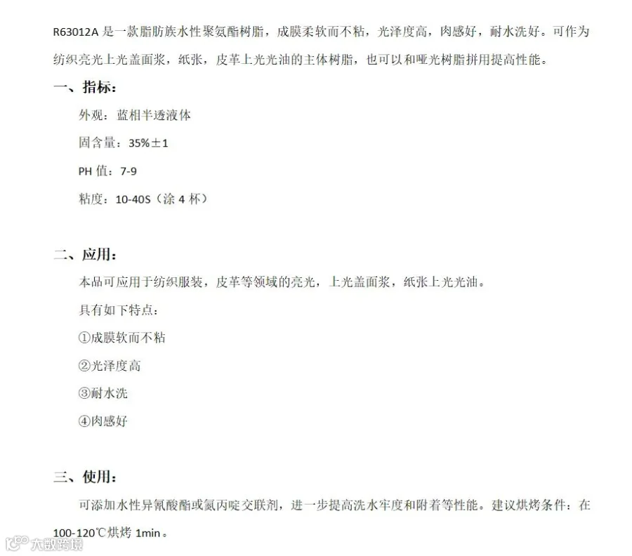 使用时,R63012A可与水性异氰酸酯或氮丙啶交联剂配合使用,以进一步提高产品的洗水牢度和附着性能。建议的烘烤条件为在100-120℃下烘烤1分钟,以确保树脂的最佳性能发挥。无论是在时尚产业、家居装饰还是汽车内饰领域,R63012A都能为皮革改色提供卓越的解决方案。