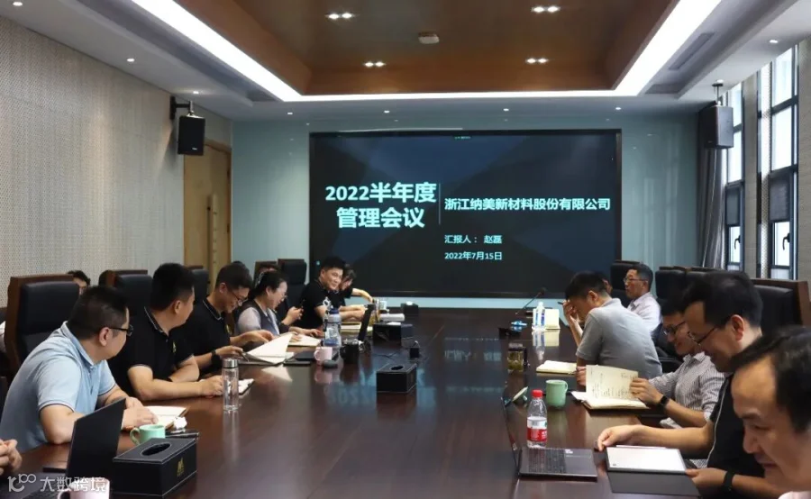 7月15日上午8点,浙江纳美新材料股份有限公司召开2022年半年度销售大会。由于疫情原因,此次会议采取远程两地视频线上与线下相结合的方式开展。会议由浙江纳美新材料股份有限公司副总经理史炜主持,纳美新材董事长赵磊和生产中心、研发中心负责人、各事业部部门代表、以及所有销售人员参加此次半年销售会议。
