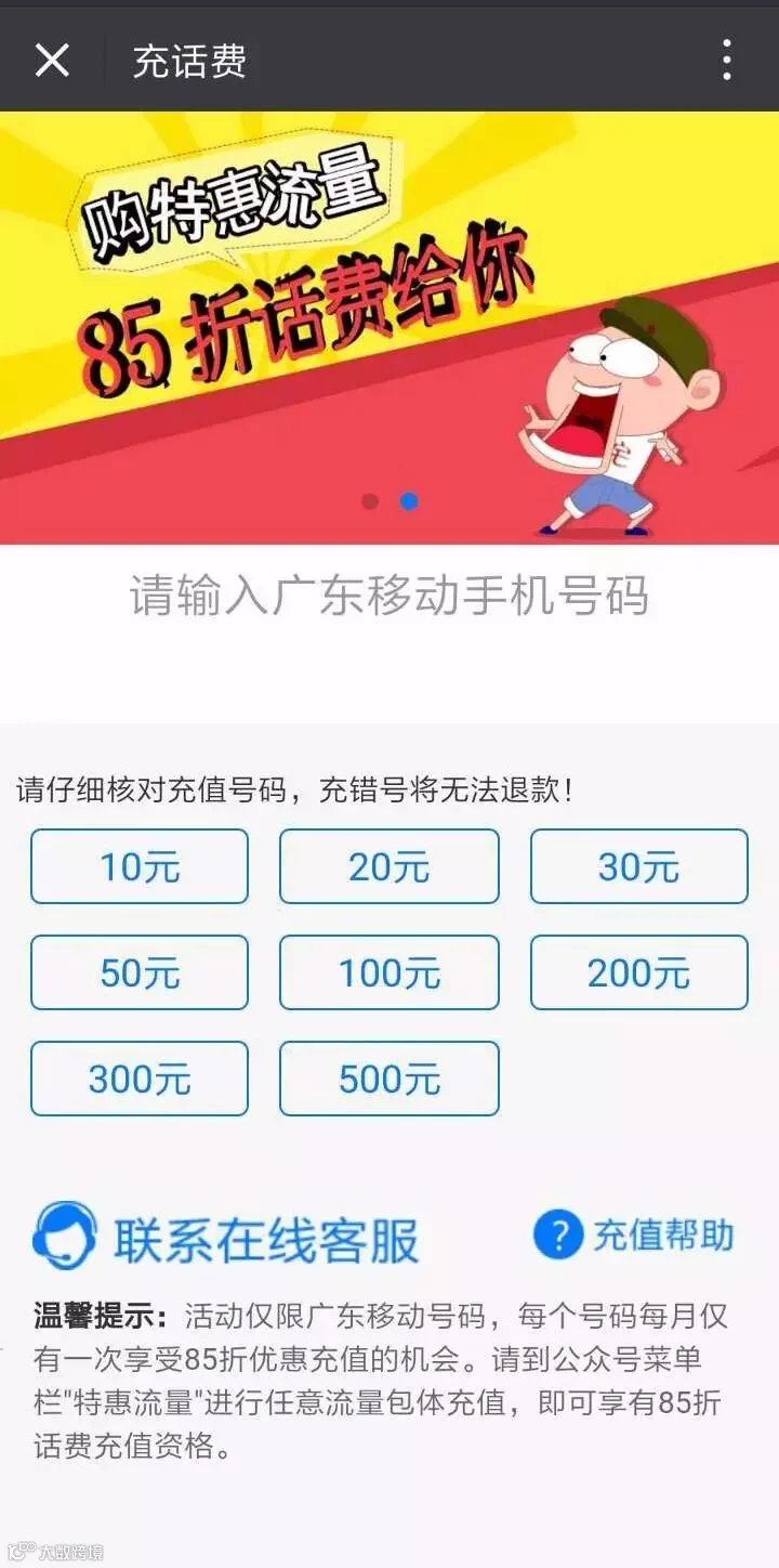 需要购买任意规格流量产品后,购买话费方可享受85折优惠