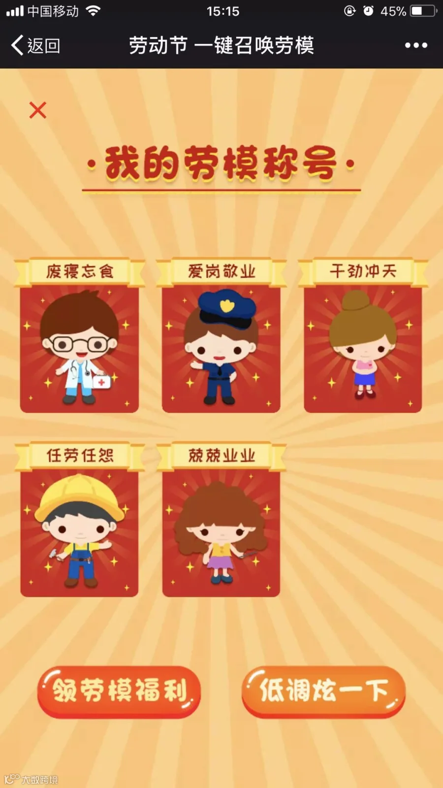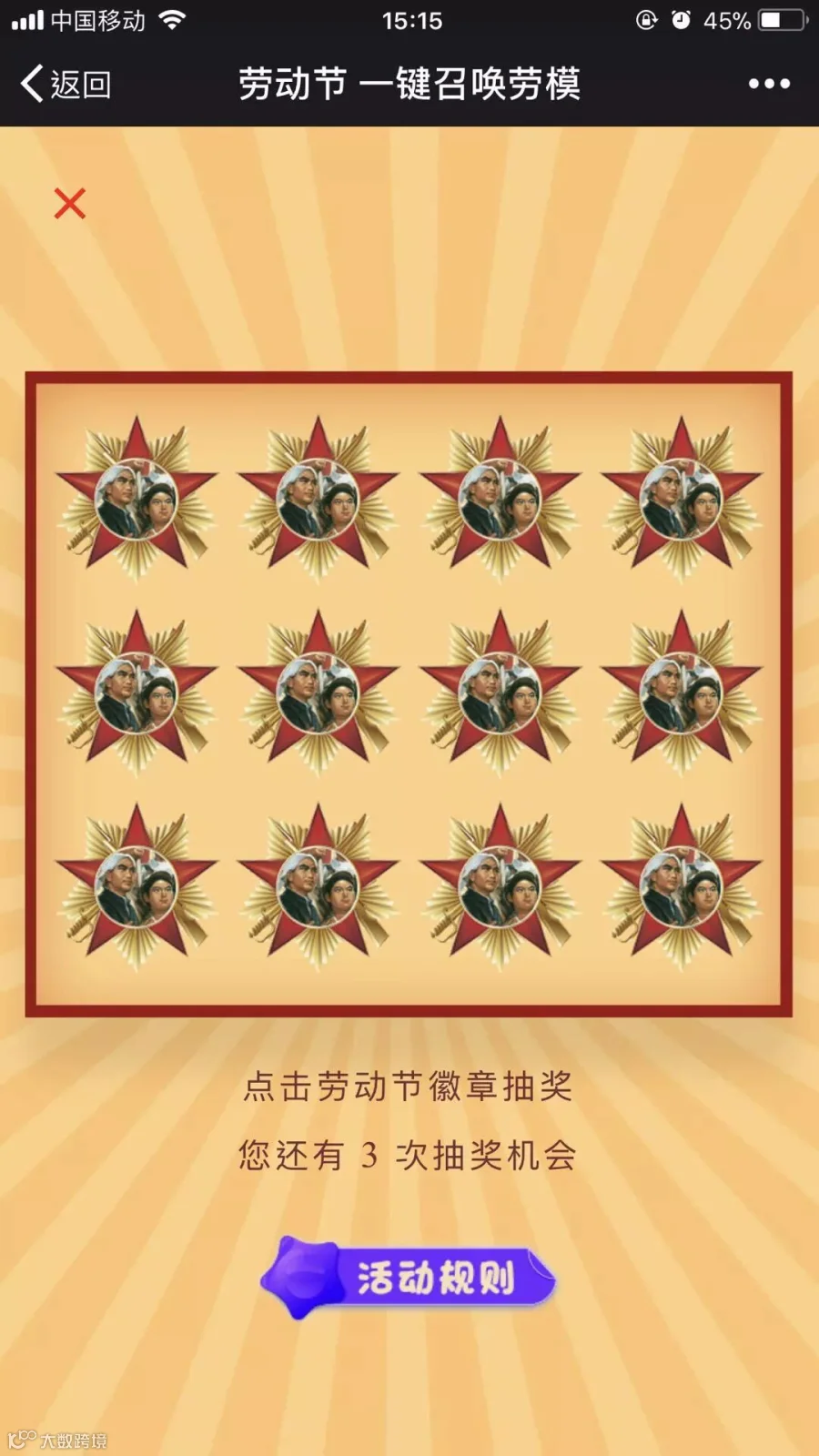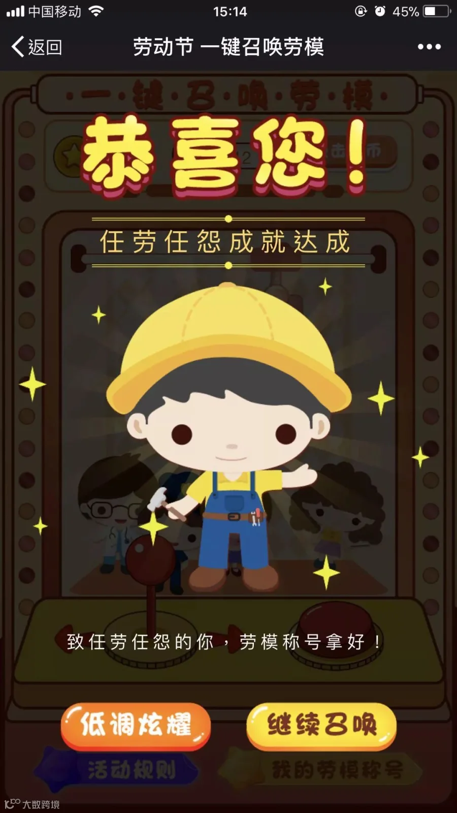 2.活动期间,用户每天可领取3个召唤币可用来投币,在限时内,抓取劳模称号代表的卡通人物形象。召唤币用完后,分享给好友或朋友圈可以再得到一个召唤币,每天最多只能分享3次。