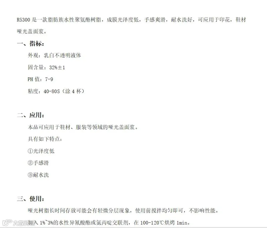在众多肤感哑光树脂产品中,R5300是一款值得推荐的产品。它是一种脂肪族水性聚氨酯树脂,具备低光泽度和手感爽滑的特点,特别适合用于需要哑光效果的表面处理,如印花和鞋材哑光盖面浆。