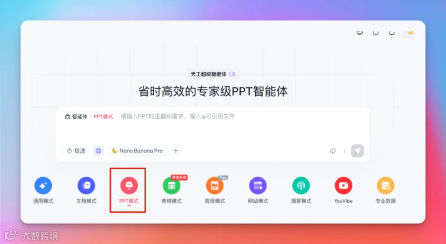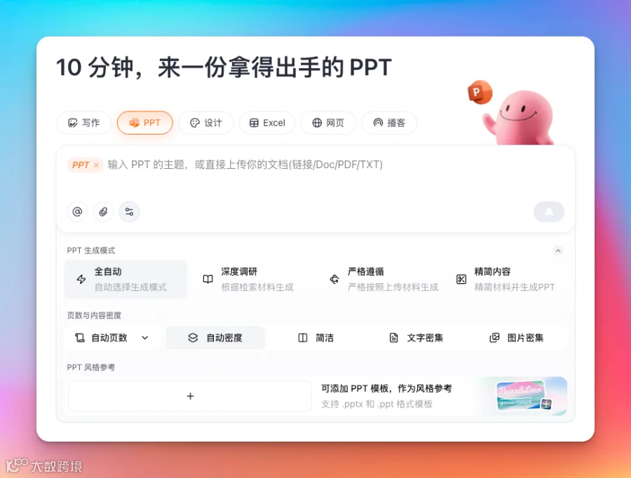 字节旗下的通用 Agent 产品,在 PPT 创作上也有两把刷子。直接打开 PPT 模式: