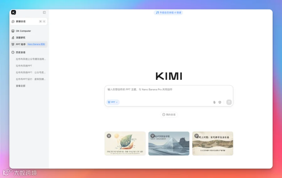 一定要开启全局代理,然后通过谷歌搜索 kimi,进入官网,就可以看到 PPT 模式。