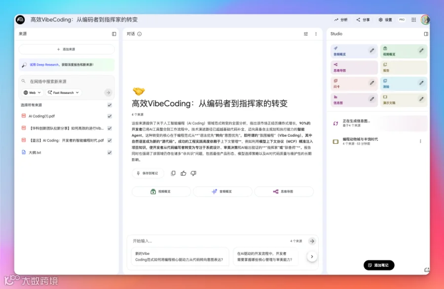 NotebookLM 是谷歌推出的知识库工具,能够上传任意文档甚至是视频 URL,基于知识库可以 AI 问答,可以做思维导图,信息图、闪卡、播客。