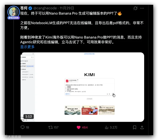 不瞒你说,最近刷 X,看到 Kimi 在国际版偷偷上线了基于 Nano Banana Pro 的 PPT 模式,还能直接在线编辑。