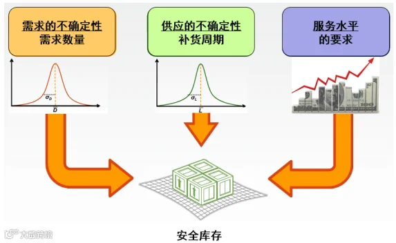 我们知道,安全库存是应对不确定性的——对于需求和供应的不确定性,供应链的自然应对就是放安全库存。如图1,安全库存有三个驱动因素:(1)需求的不确定性,比如平均需求是每周100个,但有时候是120个,有时候是70个;(2)供应的不确定性,比如供应商的标准交期是4周,但有时候都5周了,货还没有送来;(3)服务水平的要求:服务水平要求越高,就得放越多的安全库存来应对。