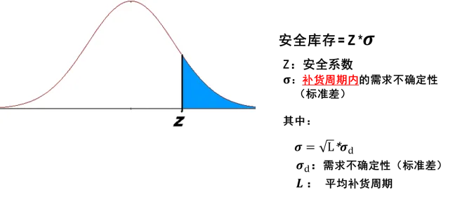 在量化了需求的不确定性,量化了服务水平的要求后,安全库存的计算就挺简单:需求的不确定性乘以安全系数,就是安全库存,如图5。