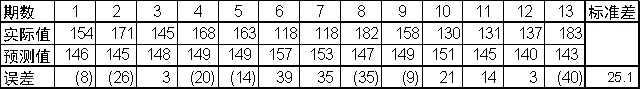 具体操作上,我们找出过去一段时间的预测和实际需求,计算两者之间的误差,围绕预测误差求其标准差。标准差越大,表明需求的不确定性越大,因而要放更多的安全库存。如图2,我们用6周移动平均来预测,计算每个预测与实际值的误差,并求得误差的标准差为25.1。