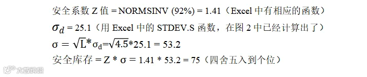 让我们回到图2中的例子。假定期数是周,产品的服务水平是92%,补货周期是4.5周。那么,所需安全库存的计算如下: