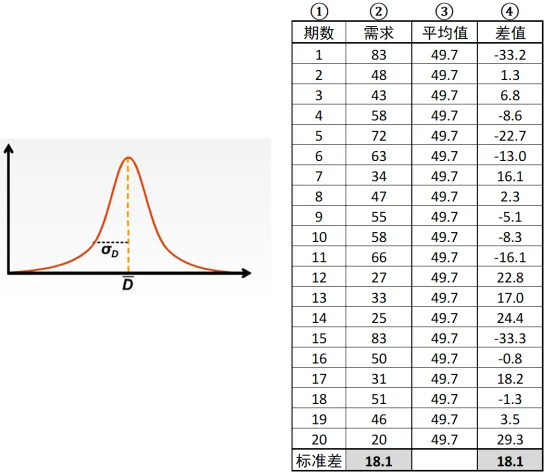 让我们实际演算一下来说明。如图3,第②列是过去20周的实际需求,第③列是过去20周需求历史的平均值,第④列是平均值与每周实际需求的差值(误差)。看得出,围绕第②和第④列求标准差,两者的结果完全相同。