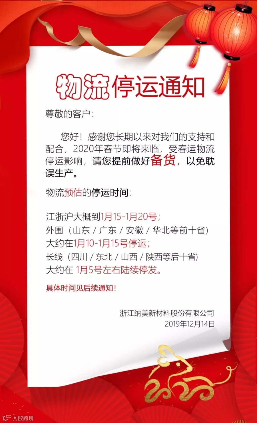导读:2020年春节即将来临,受春运物流停运影响,请您提前做好备货,以免耽误生产。