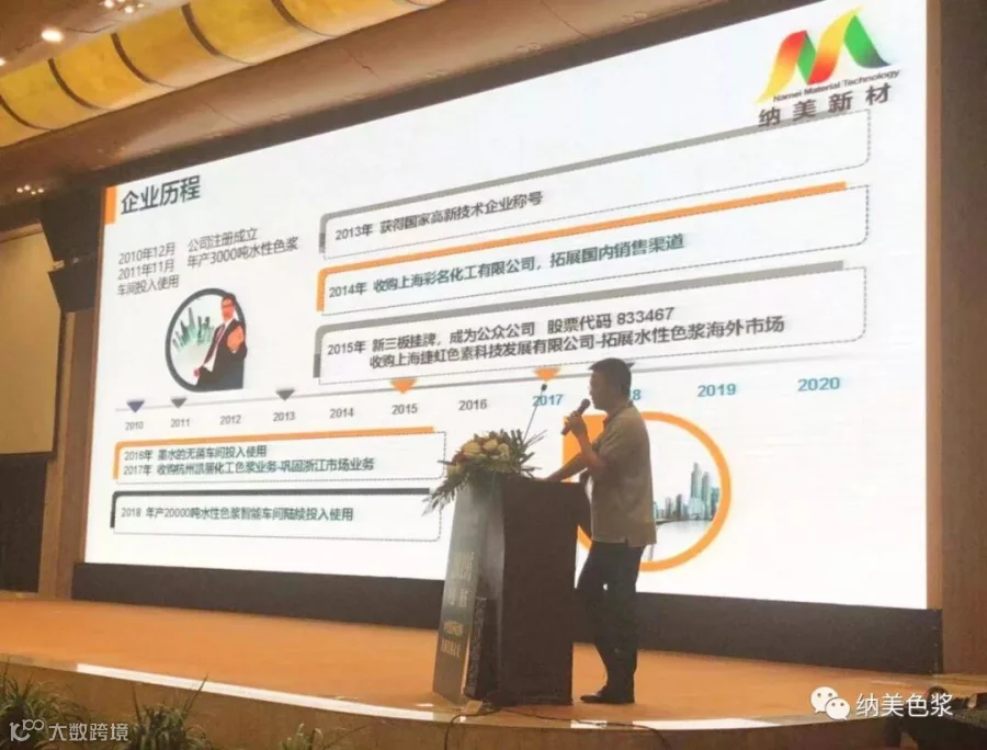 浙江纳美新材料股份有限公司(证券代码:833467)成立于2010年,位于浙江省安吉县。是一家从事纳米颜料色浆和UV/LED功能性材料的研发、生产和销售的国家高新技术企业。