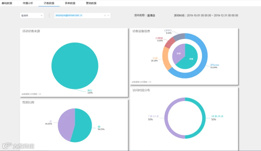 数据罗盘功能分别从:基础数据、传播分析、访客数据、表单数据、营销数据5个方面对数据进行分析,让营销效果一目了然。