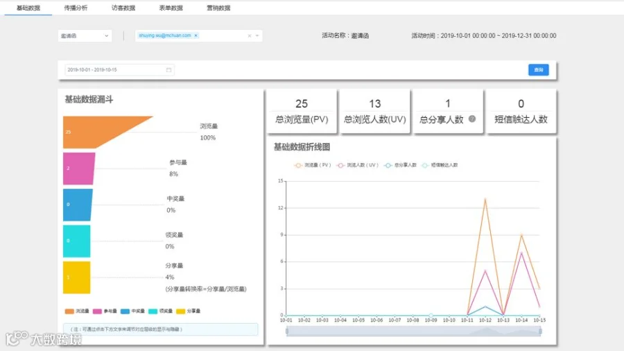 用数据漏斗和折线图的形式,展示了H5活动的各项基本数据,清晰易懂,简洁明了。