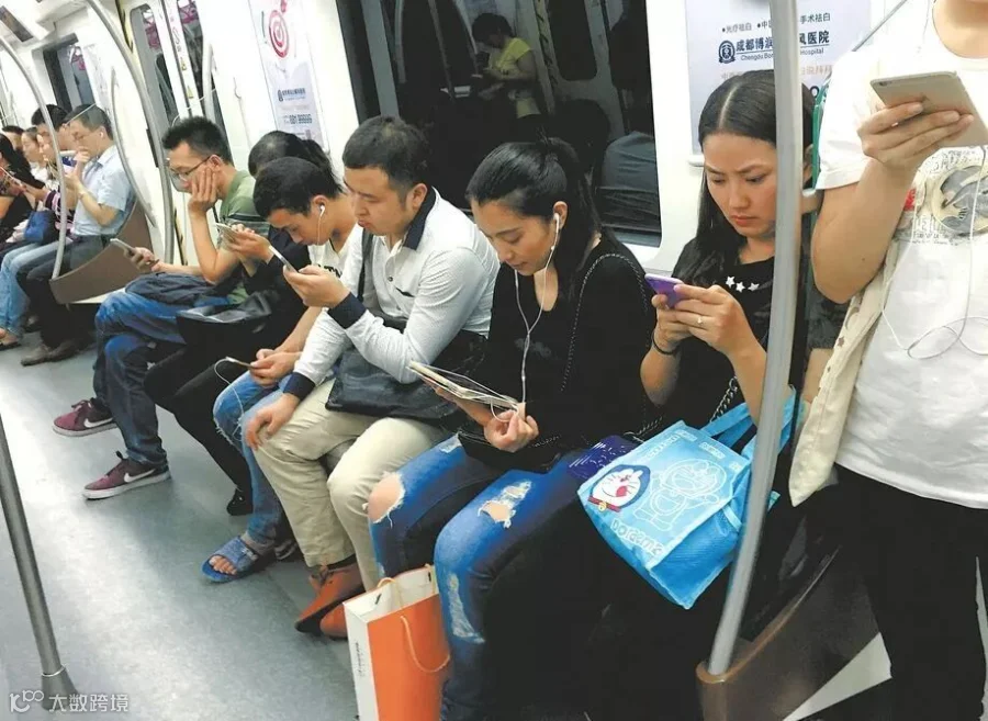 ▲在地铁玩手机的人们