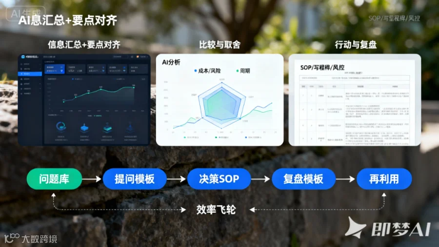效率飞轮就此形成:问题库 → 提问模板 → 决策SOP → 复盘模板 → 再利用。