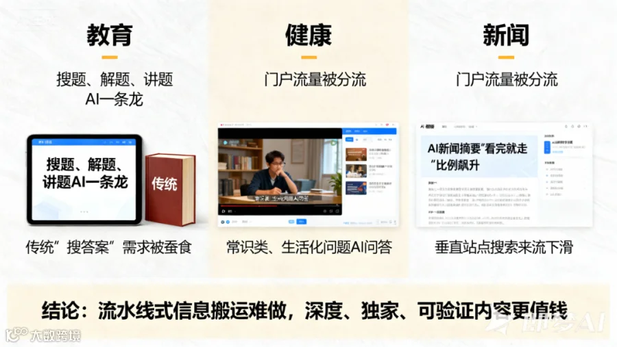 1) 教育:搜题、解题、讲题,AI一条龙;传统“搜答案”的需求被蚕食。