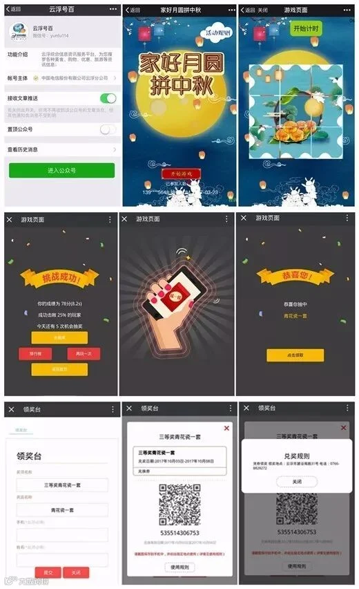 恰逢国庆中秋这样一个普天同庆举家团圆的日子,“云浮号百”借助快速营销平台的中秋模板,推出“家好月圆拼中秋”拼拼图抽大奖活动,以此为“云浮号百”公众号的粉丝送礼!