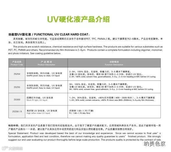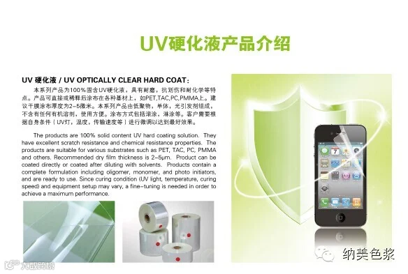 100%固含UV硬化液,具有高耐磨,抗划伤和耐化学腐蚀性能好等特点。