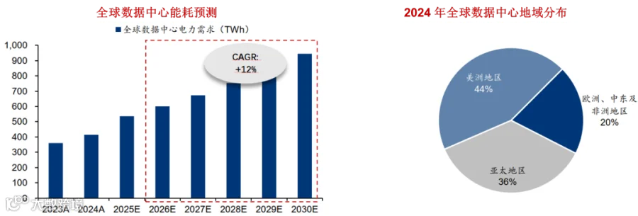 2024 年全球数据中心规模约 50GW;IEA 预测 2030 年其电耗较 2022 年翻倍,JLL 预计未来五年能耗翻倍至 100GW,2025-2027 年 CAGR 15%(乐观 20%)。2024 年分布:北美 30GW(60%)、亚太 13GW(26%)、欧非中东 7GW(14%)。
