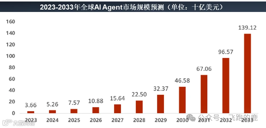 未来十年 AI Agent 市场猛涨,2033 年全球规模超 1300 亿(Market.us 1391.2 亿),2023-2033 年均增近 44%、十年翻超 50 倍。麦肯锡称生成式 AI 像 “智能生产车间”,助营销、客服等场景增收;16 领域 63 个 AI 应用年创 2.6-4.4 万亿(1-2 个英国 GDP),全面渗透后潜在价值近日本 GDP。