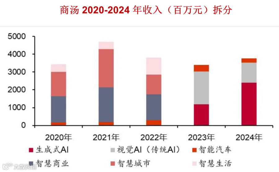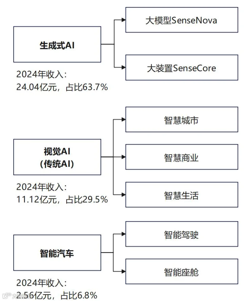 公司核心业务是生成式 AI。2024 年这块业务营收突破 24 亿元,同比增长 103.1%,在集团收入中的占比提升到 63.7%;第二大业务是视觉 AI(传统 AI),收入占集团营收的 29.5%;智能汽车业务收入 2.56 亿元,占比 6.8%。