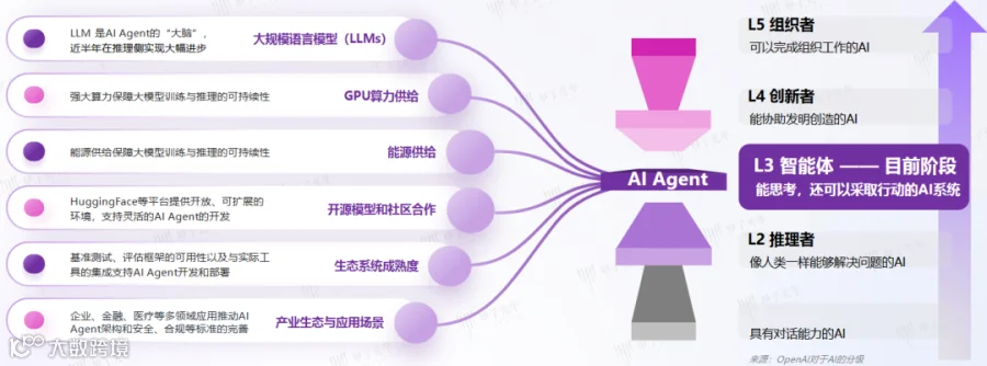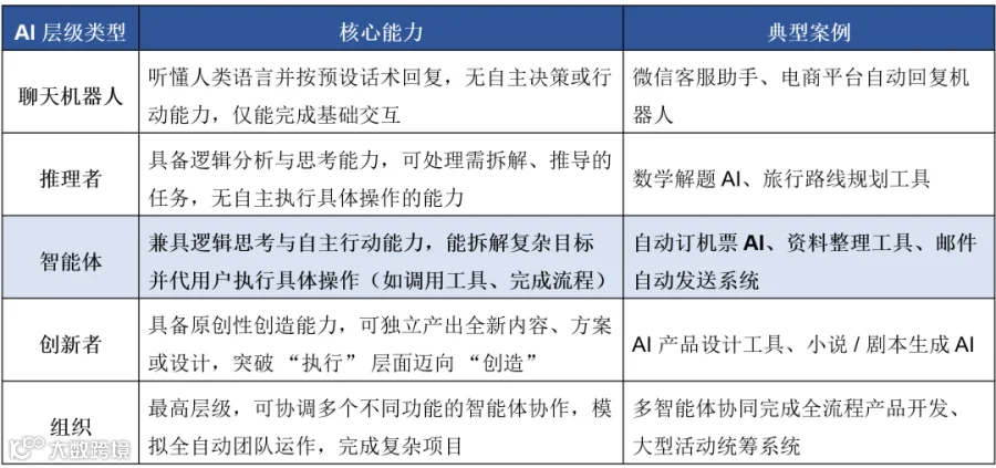 AI 的能力被分成五个等级,从只会简单对话的 “新手期”,正一步步进化到能主动帮你办事的 “高阶状态”。智能体便是当下最先进的状态: