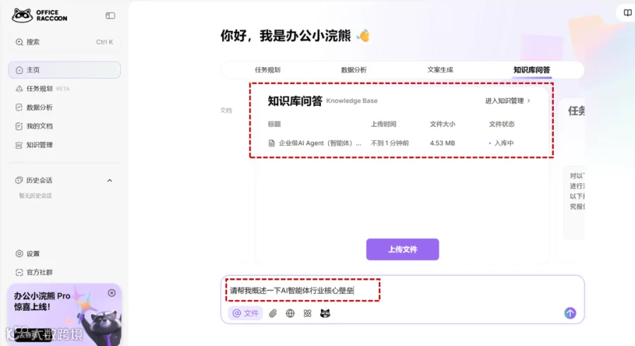 就像在进行这次AI智能体行业分析时,在网络上下载了一份长篇报告,内容晦涩复杂,借助办公小浣熊,上传文件作为备用知识库,让他帮我提炼行业核心壁垒——