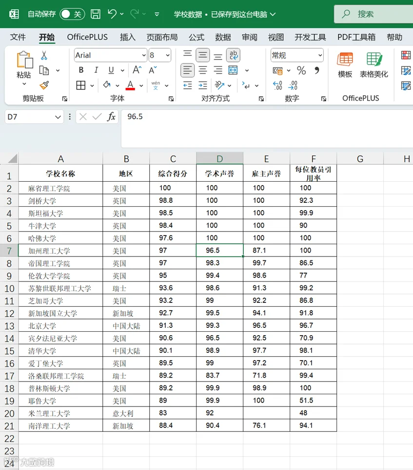 AI 智能体的使用可以说是大大提升了工作效率,办公小浣熊的数据分析尤其对我帮助巨大。就像分析各国世界名校的综合实力时,平时在excel上处理需要借助公式进行计算,比如数据源如下:
