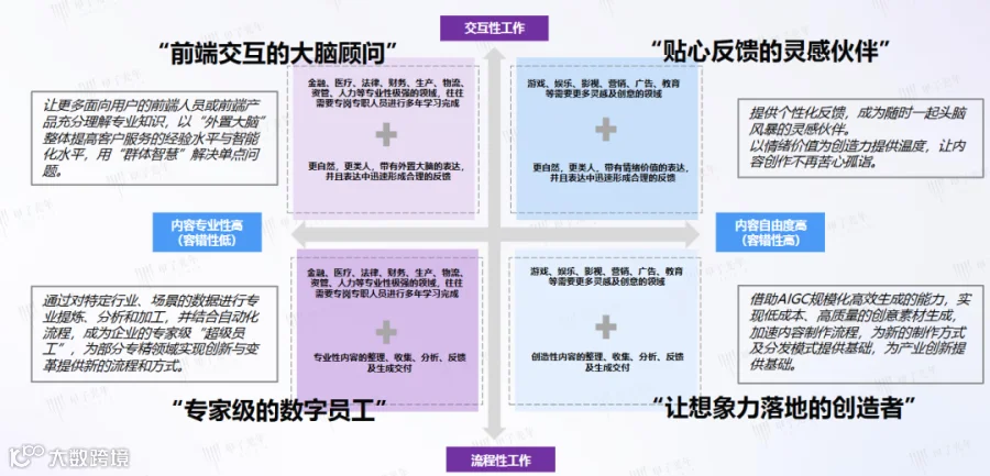 专业领域(金融 / 医疗等)里,AI 是交互端 “大脑顾问”、流程侧 “数字员工”,创意领域(游戏 / 营销等)中,化身交互时 “灵感伙伴”、流程里 “创意生产者” ;清晰展现 AI 在不同场景适配技术与需求的逻辑,连接专业与创意、交互与流程的价值分工。