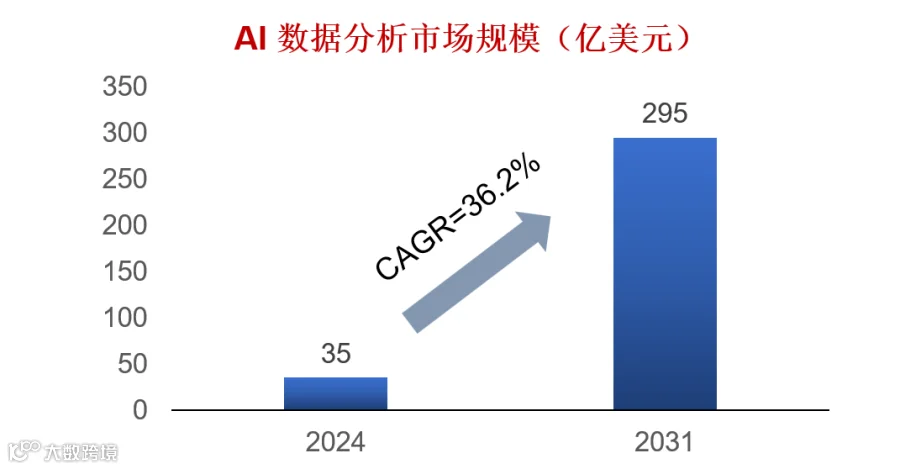 展望未来,该市场增长潜力将进一步释放,预计至 2031 年规模突破 295 亿美元,2024-2031 年期间年复合增长率(CAGR)高达 36.2%。这一高速增长曲线的背后,AI 智能体的技术成熟与场景渗透将成为核心助推器,其在复杂业务场景中的自主分析、动态优化能力,正持续拓宽 AI 数据分析的应用边界(如工业质检、金融风控、医疗诊断等)。