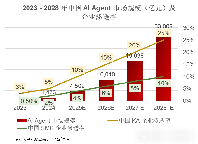 中国 AI Agent 市场刚起步,2024 年 1473 亿元但企业渗透率不足 5%;随着它给 SaaS 软件增效(如 CRM 自动析客户数据、财务软件自动做报表),加上定制化开发市场成熟,2028 年规模预计飙到 3.3 万亿元(1.5 个 2023 年上海 GDP)。按应用场景分,若和 SaaS 比例一致,企业管理与办公类占 40%,销售营销占 30%,人力资源占 10%。