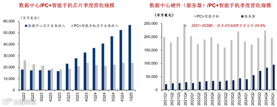 从各家公司财报能看到,自 2023 年第三季度起,英伟达、AMD、博通这些做数据中心芯片的,加起来的营收已经超过了英特尔、高通、联发科这些做 PC 和手机芯片的营收总和;到 2025 年一季度,这个规模更是涨到了后者的两倍。