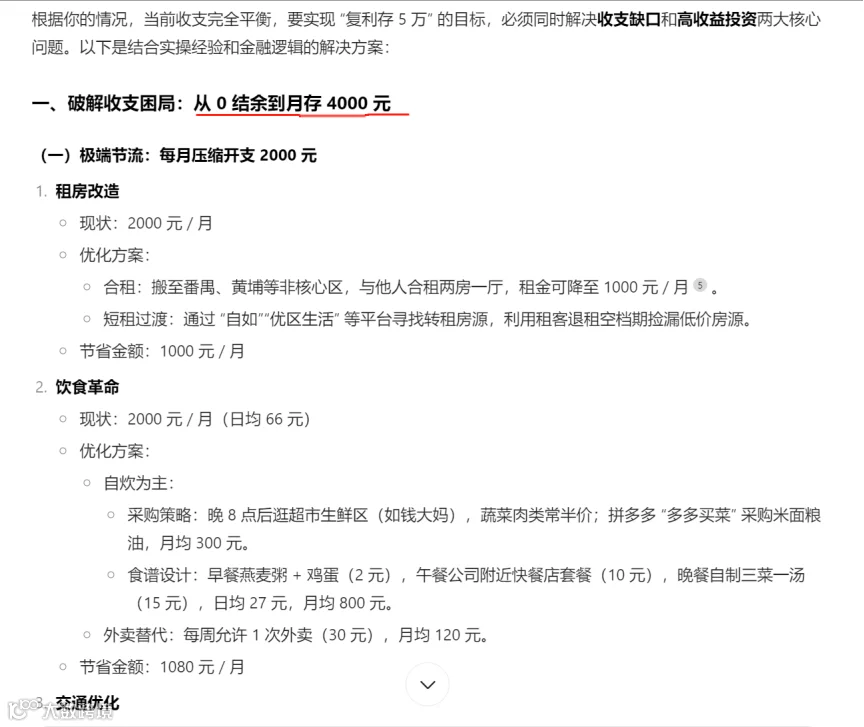 省钱:换合租、自己做饭、交通靠共享单车(和Deepseek差不多,但更简洁)。