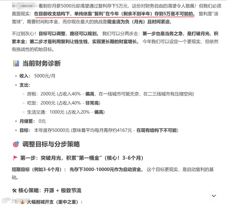 最后还贴心提醒:“今年存5万别想了,先定个小目标——比如半年存5000。” 像极了健身教练对胖子说:“先瘦到200斤再说。”