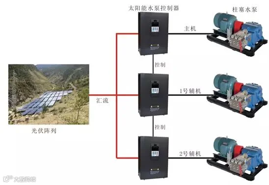 太阳能水泵系统主要由太阳能组件、太阳能水泵控制器和水泵组成,根据项目的各项参数要求,三晶电气提出了多联机的技术解决方案,系统结构如下图所示: