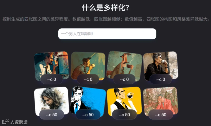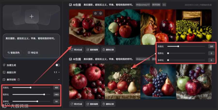 通常来说,如果你不想要一些奇奇怪怪(也可能是创意哦)的效果,风格化建议控制在0-200之间,怪异化建议设置为0,多样化也设置为0。