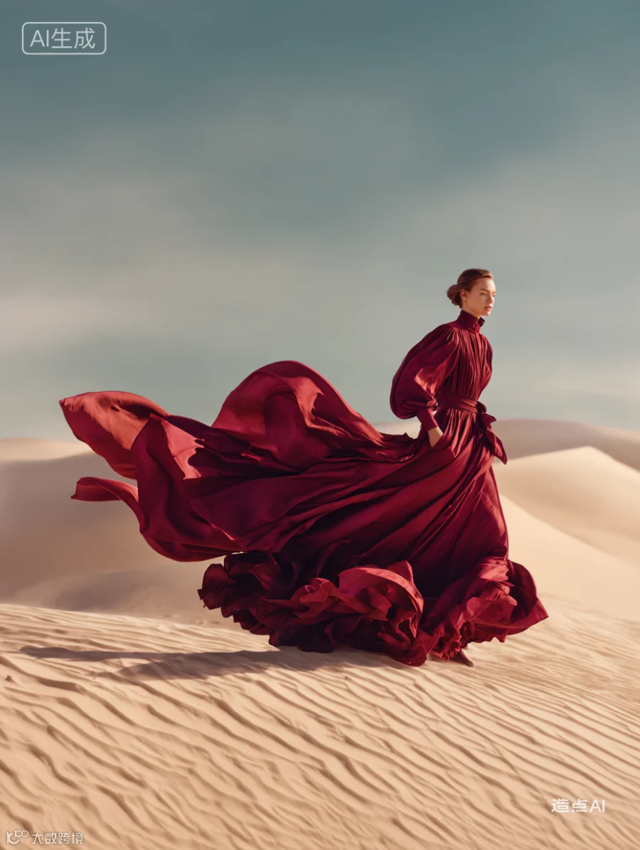 中文:撒哈拉沙漠的超现实场景,女模特身着流动的深红色丝绸高级定制时装,织物如火焰般扭曲,极度详细的沙粒细节和温暖的渐变天空,灵感来源于Tim Walker。