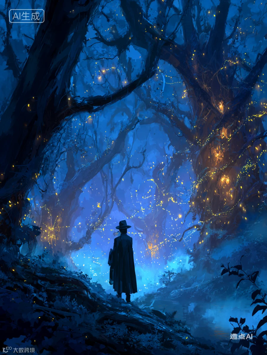 中文:在暮色中,一片充满神秘色彩的森林:古老的树木散发着光芒,其叶片具有生物发光特性,正对着一位披着维多利亚时代斗篷的孤独探险者低语着秘密;萤火虫在空中划出旋转的图案,仿佛拼写着早已被遗忘的符文;迷雾在覆盖着苔藓的树根间弥漫开来,整个场景融合了萨尔瓦多·达利与吉卜力工作室的艺术风格。