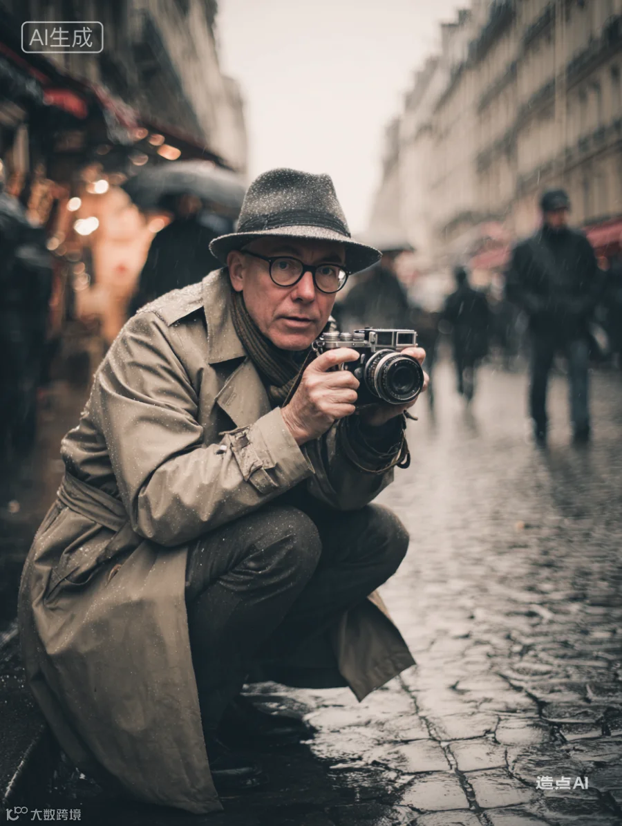 中文:一位中年街头摄影师,穿着破旧的风衣。在巴黎下雨的街道上,他跪在地上,用他的复古徕卡相机记录下这一刻:眼镜上沾着水珠,背景中的行人模糊不清;鹅卵石在路灯下闪闪发光。整个画面采用纪实风格的写实手法,色调以偏灰为主,但带有淡淡的暖色调,呈现出一张自然、真实的三分之四视角的照片。