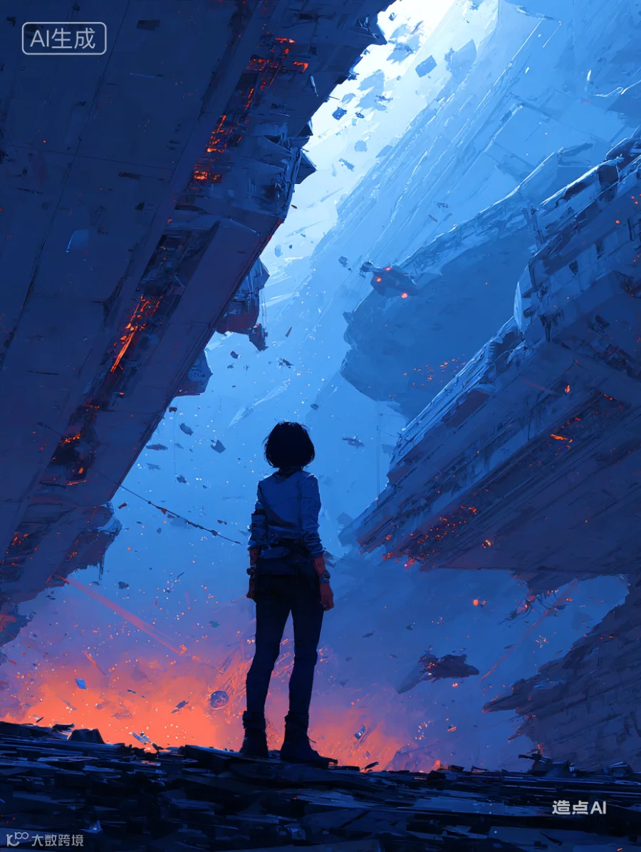中文:在浩瀚的太空废墟中,一位穿着未来时尚服装的人物孤独地徘徊。维度坍缩的空间中,星辰与黑洞交错,光影错综复杂。背景悬浮着破碎的星舰残骸和扭曲的空间结构,营造出科幻概念艺术的氛围。色调以深蓝、紫色和橙红色为主,光影对比强烈,呈现出时尚摄影的视觉冲击力。