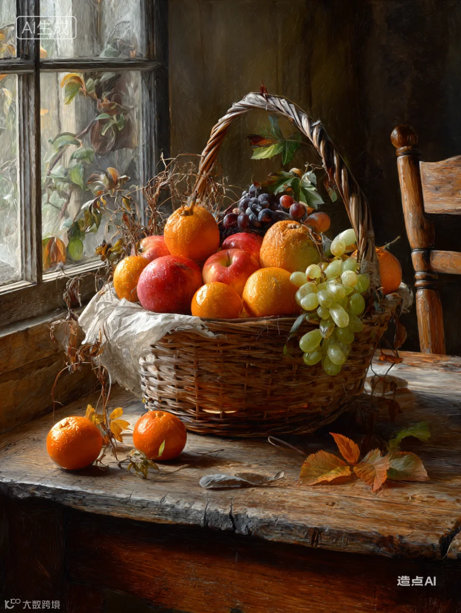 中文:一张质朴的木质厨房餐桌,上面放着一个柳条编成的篮子,里面装满了新鲜的苹果、橙子和葡萄。附近窗户透进来的晨光照射在水果表皮上的露珠和细腻的木纹上,地上还散落着几片落叶。整个场景呈现出超写实的静物画风格,宛如荷兰大师的作品:运用自然光色调,营造出柔和的阴影效果,同时采用了特写宏观视角进行拍摄。