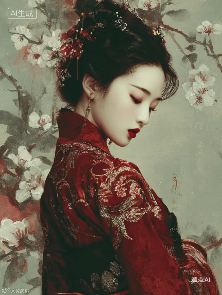 古典水墨画中的仕女缓缓动起来,裙摆随风微扬,她从画布中一步步走出,色彩逐渐变为鲜活的彩色,伴随衣袖拂动的“沙沙”声与轻微风铃声,背景配上古筝与箫的悠扬旋律。